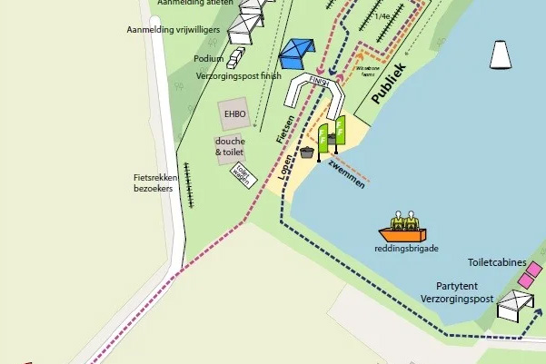 Je stapt van de fiets bij het hek, loop met je fiets aan de hand over de mat voor de tijdsregistratie, je houdt nu ook weer rechts aan en loopt om de fietsen heen om achteraan richting je hardloopschoenen te lopen. Alles gewisseld, ren je richting het hek, maar voor het hek ga je links af langs het water en daar start je laatste onderdeel.
