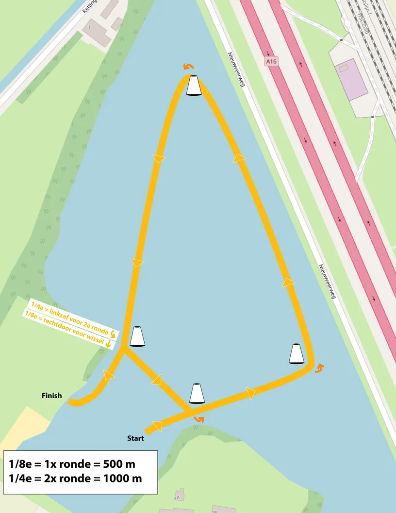 Er wordt om 4 boeien gezommen linksom. Je zwemt rechts van de boeien.